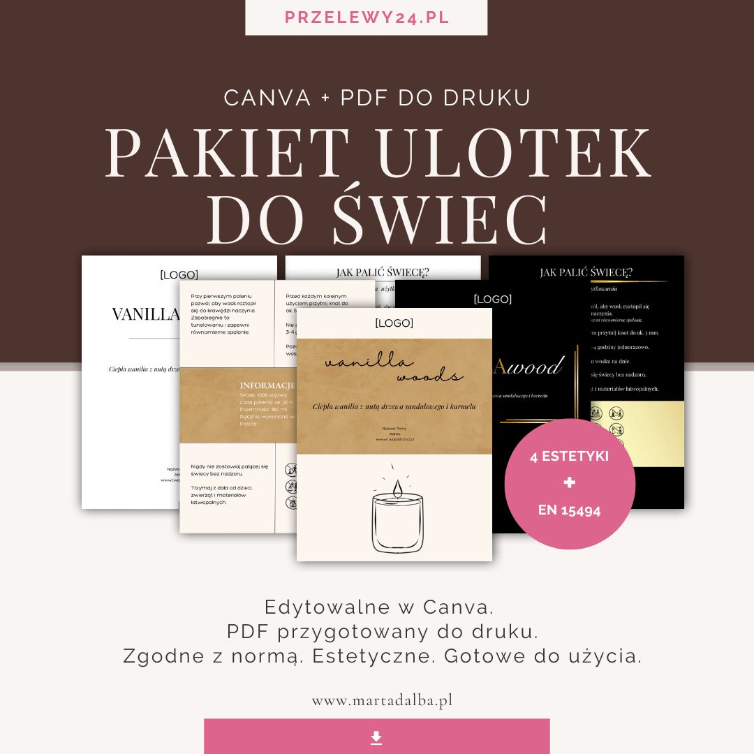 Pakiet ulotek do świec – 4 estetyki | EN 15494 | Canva + PDF do druku