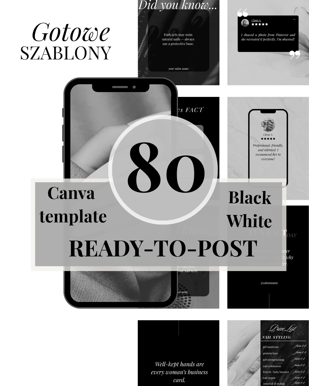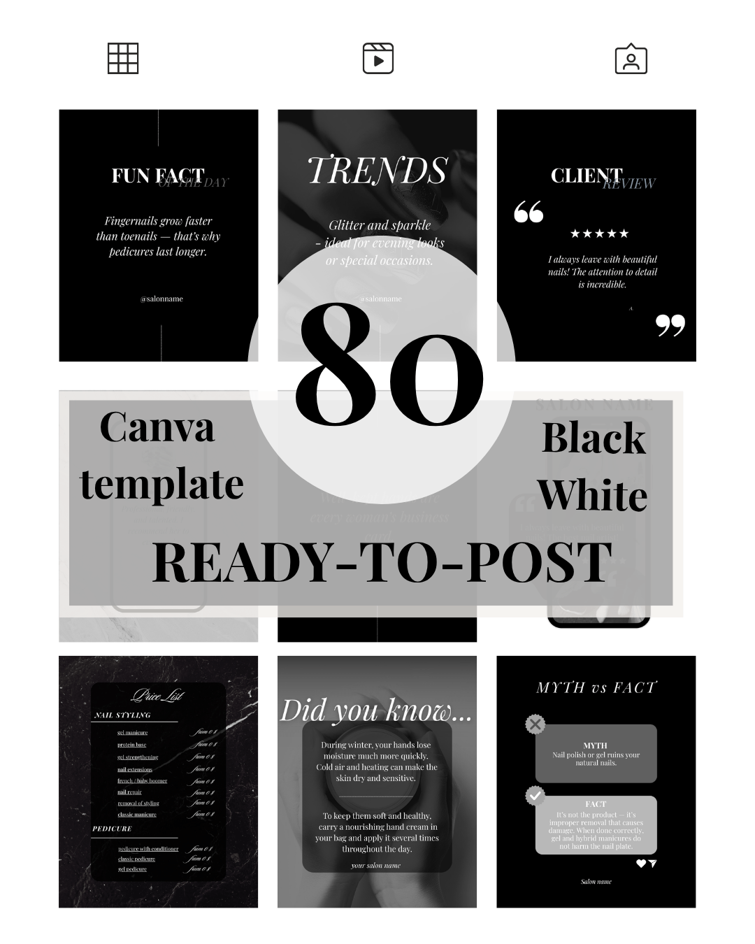 This set includes 80 fully editable Canva templates designed for nail technicians and beauty salons. The black and white minimalist aesthetic creates a strong, modern and sophisticated look that instantly elevates your profile and makes it stand out.